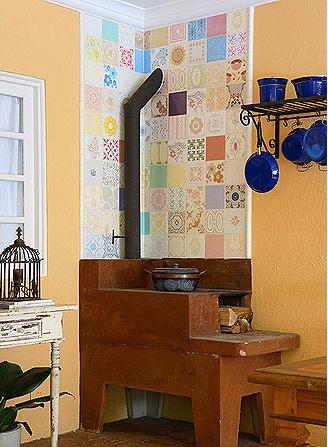 Detalhe da cozinha com painel de azulejos da Casa Antiga (15 x 15 cm) que se espalham por dois painéis. Cantoneiras azulejadas fazem o acabamento das peças