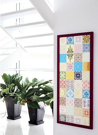 Azulejos antigos, de diferentes estampas, podem formar um painel criativo. Basta rejuntá-los sobre uma base, de preferência de madeira, e então dar um toque colorido na parede