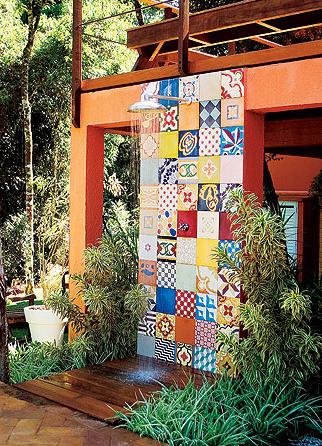 O chuveirão no jardim da casa ganhou mais charme e cor graças ao lindo painel de ladrilhos hidráulicos