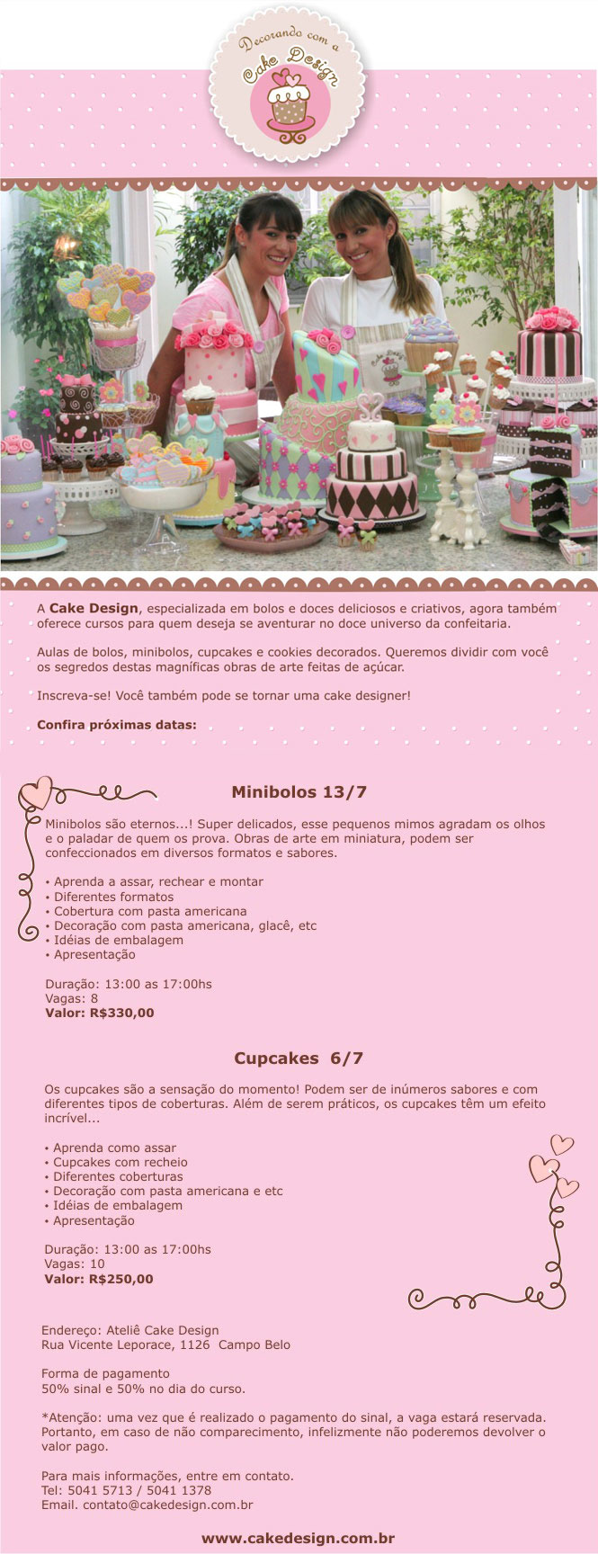 Já falei aqui no blog sobre o curso de cupcakes que o Atelier Silvia Carlos oferece, e recebi essa semana uma newsletter da Cake Design informando sobre seus cursos também. O Ateliê fica no bairro Campo Belo, Zona Sul da cidade de São Paulo, na Rua Vicente Leporace, nº 1126. Confira!