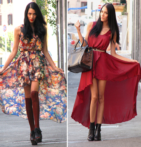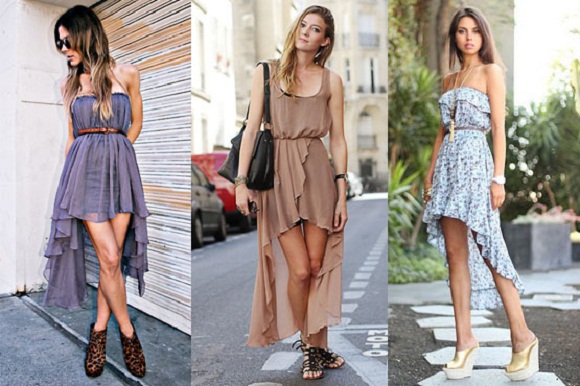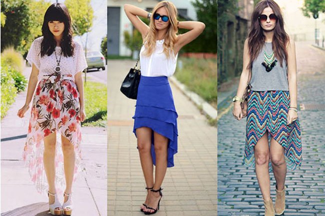 A cauda não se restringe às saias, encontraremos também em vestidos, blusas e tops. Os tecidos devem ser sempre leves e fluidos, sendo possível abusar das transparências, para dar o movimento que o modelo pede.