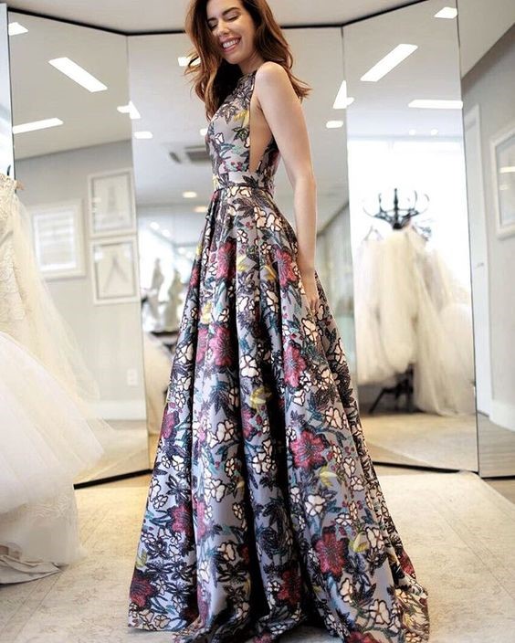 Que tal optar por um vestido evasê longo? O decote lateral do vestido de Camila Coutinho dá a medida certa de sensualidade, e o estilo romântico fica evidente na estampa floral e no shape da peça.