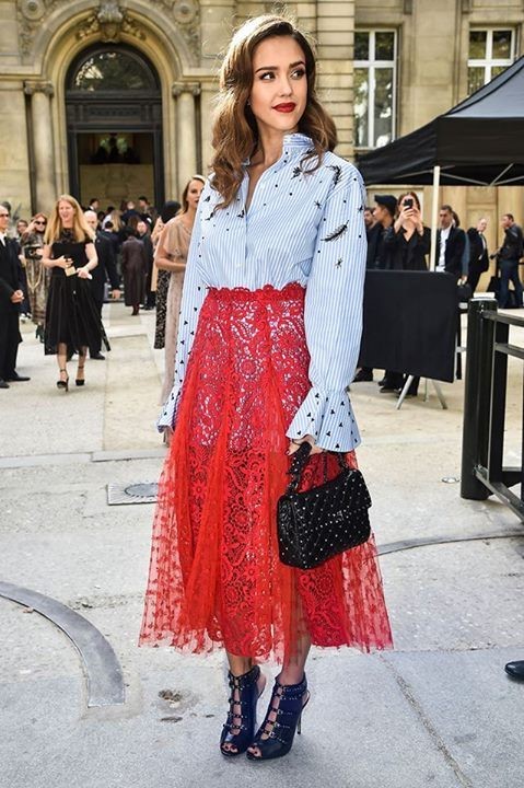 Jessica Alba sabe como combinar tendências! Aqui, a saia de renda evasê translúcida combinou perfeitamente com a camisa oversized, criando uma produção super fashionista, que fica completa com a sandália de tiras. Vale apostar em um look parecido!